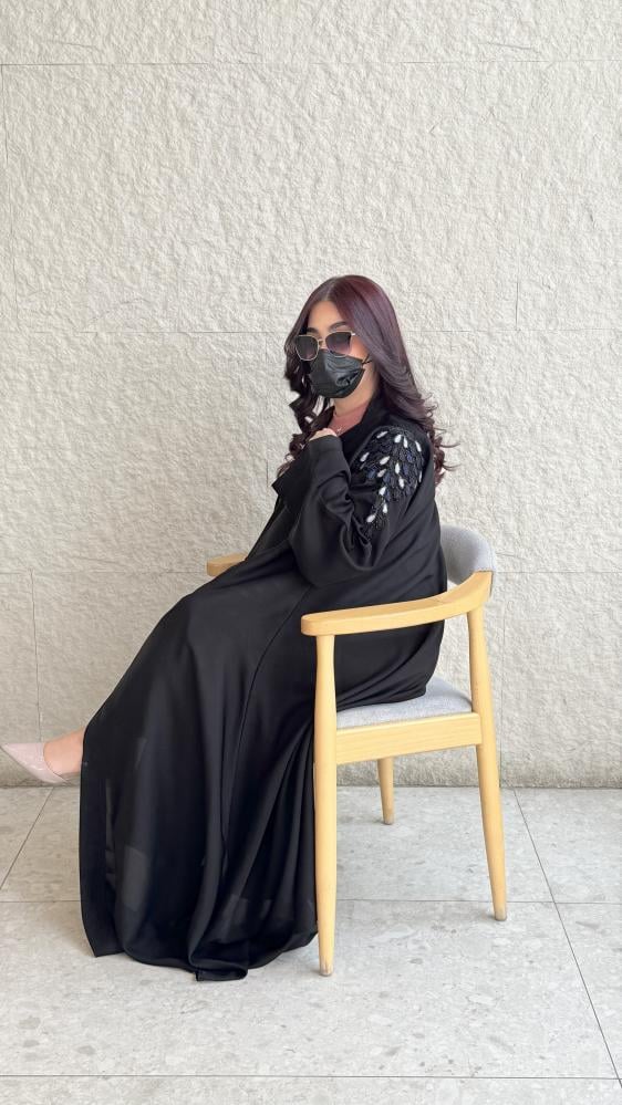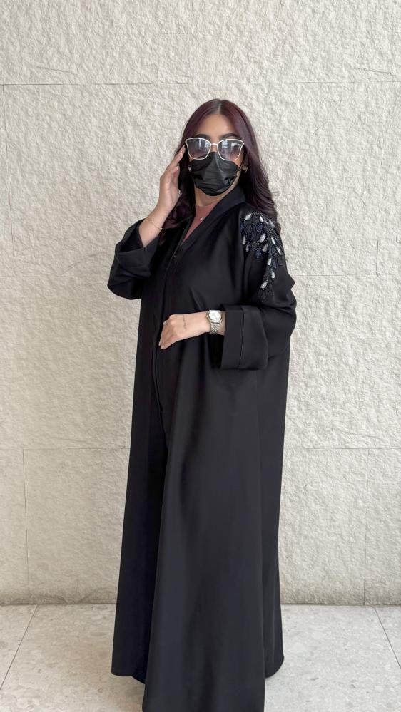 عباية أنيقة باللون الأسود، مزينة بتطريز فاخر على الأكتاف على شكل ريش أبيض متداخل مع درجات لونية أنيقة، تمنح الإطلالة لمسة فريدة تجمع بين الفخامة والتميز. مناسبة للمناسبات الخاصة والإطلالات العصرية الراقية.