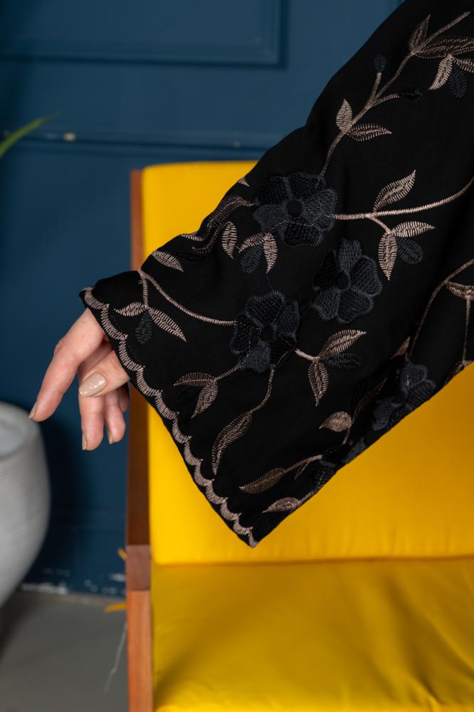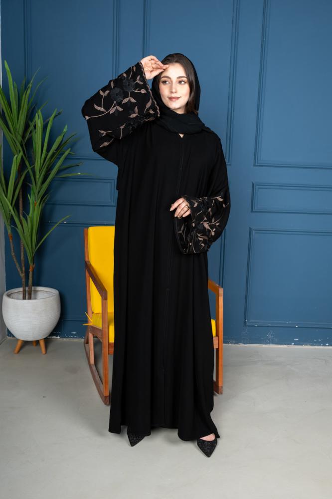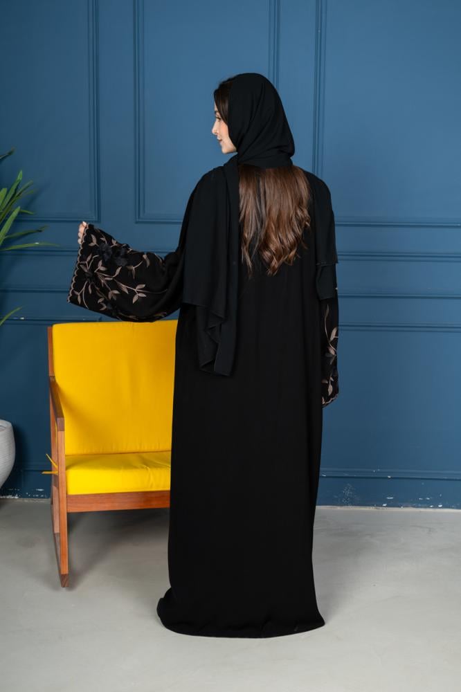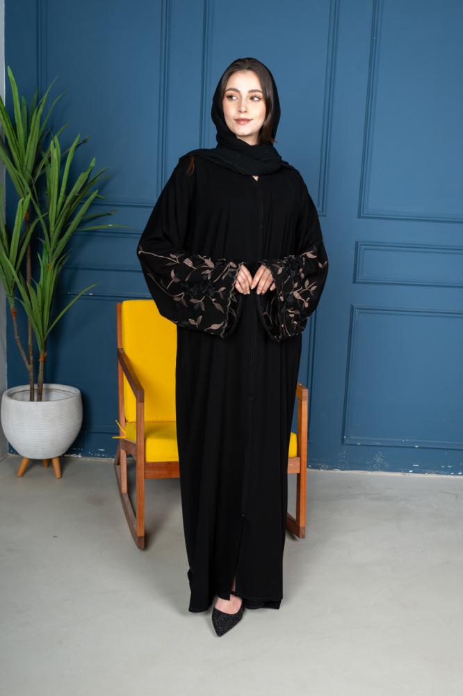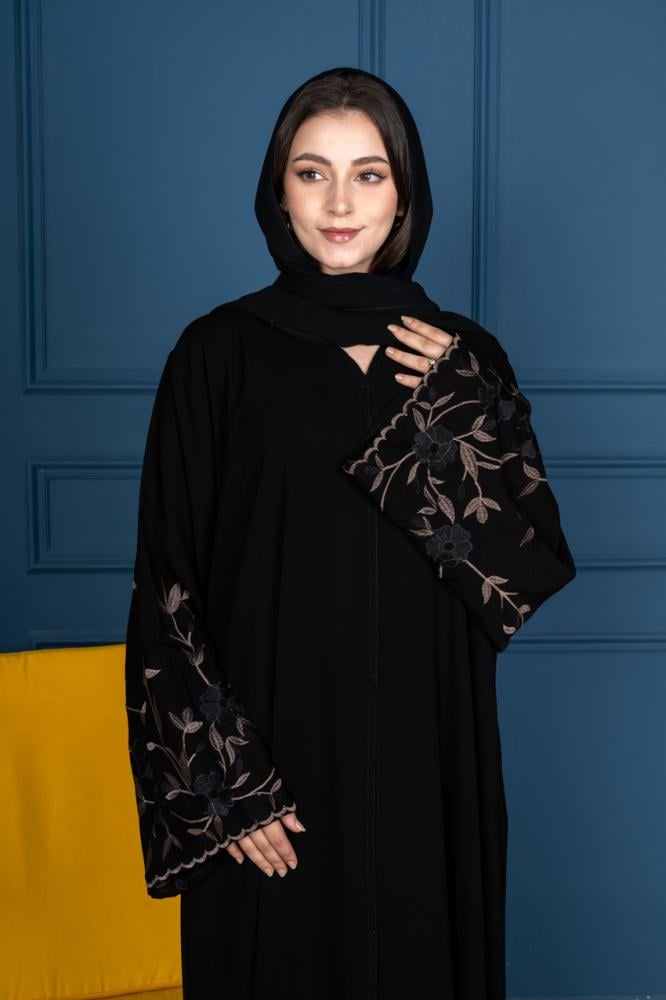 وصف المنتج: عباية مزينة بتطريز ورود ومنسقة باللون البني
