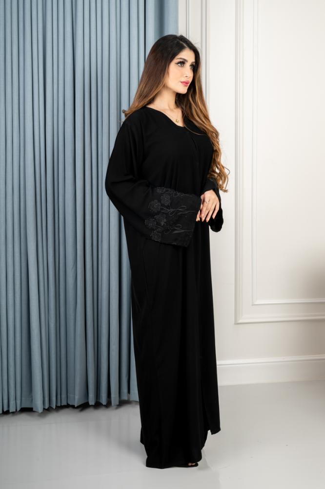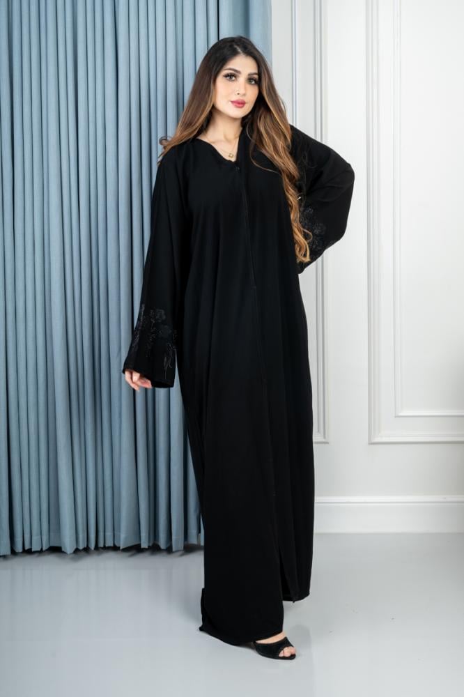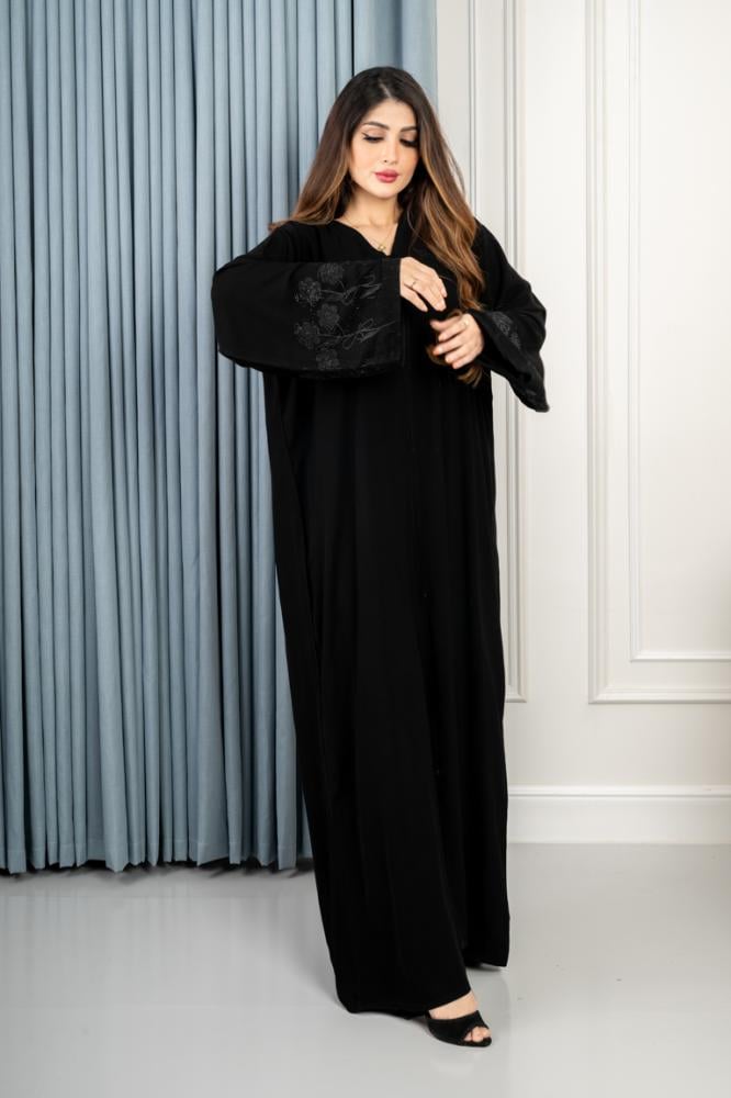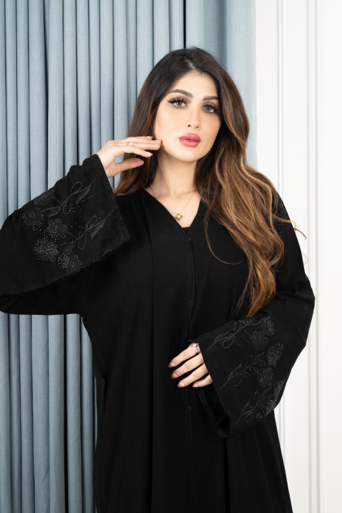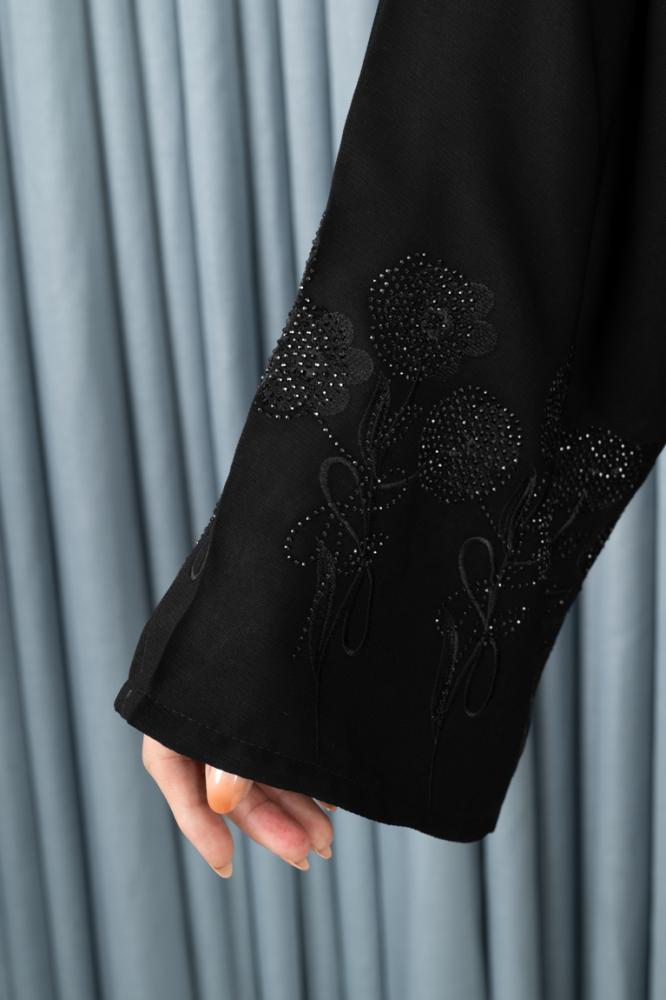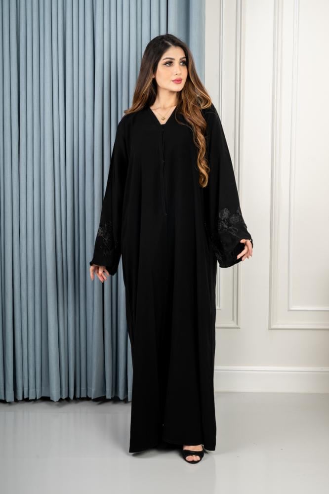 وصف العباية: عباية أنيقة بتصميم فاخر، تتميز بتطريز جميل على الأكمام بتصميم مستوحى من شكل زهرة. كما تزين الأكمام بفصوص لامعة تضفي لمسة من الفخامة والتميز. مثالية للمناسبات الخاصة.
