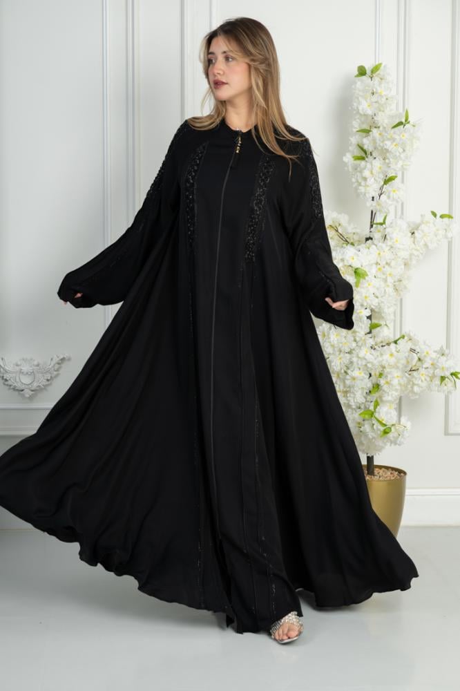 عباية أنيقة بتفاصيل دقيقة من التطريز الأسود على الصدر والأكمام، تمنحك إطلالة فخمة وراقية في كل مناسبة.