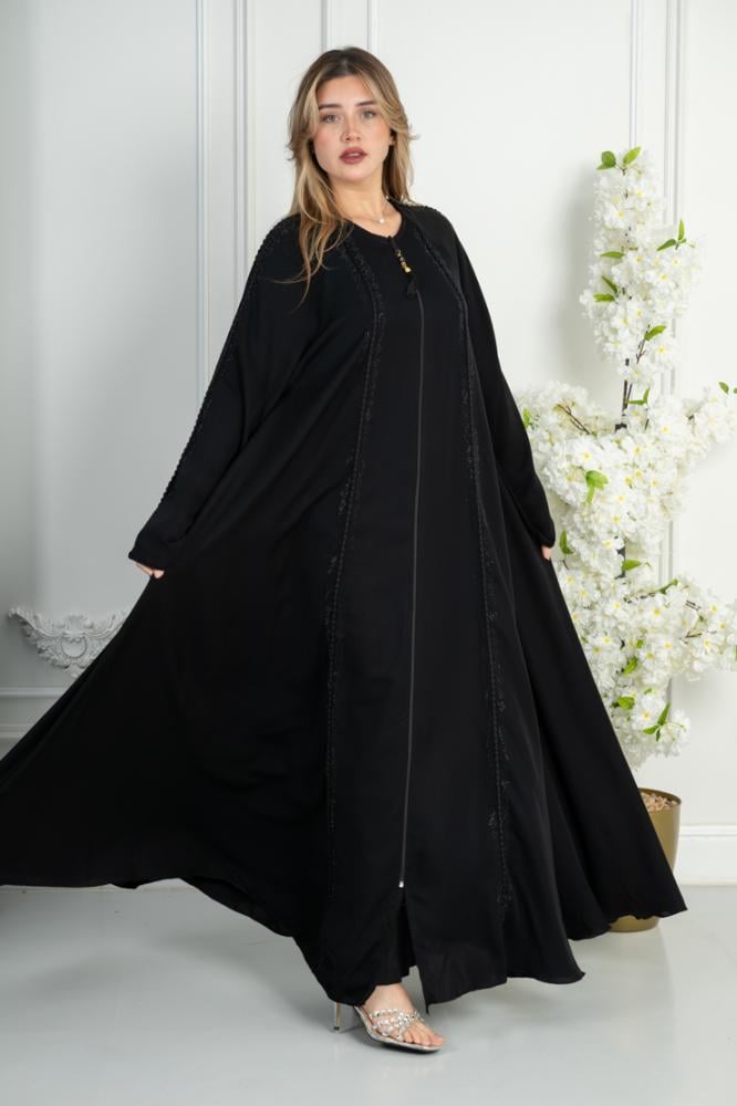 وصف المنتج: عباية كلوش راقية بتدخيلة سحاب وكلفه فصوص وقيطان على كامل العباية